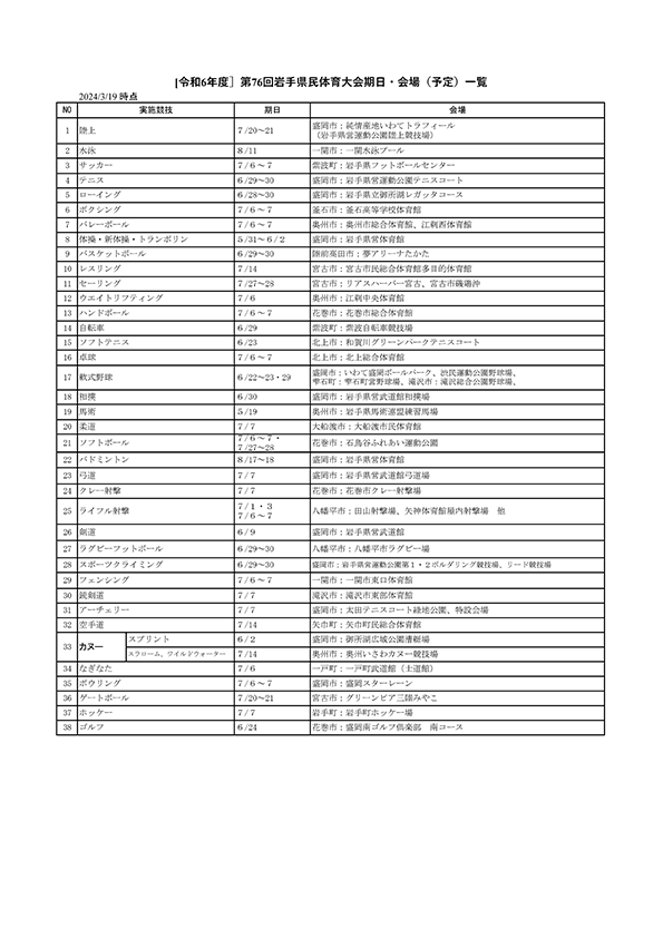 | 37 | ホッケー | ● | ● | 中止 | 7/7 | ○ | ○ | 岩手町:岩手町ホッケー場 |